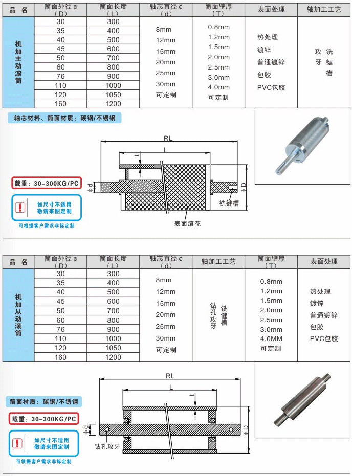 根據(jù)輸送環(huán)境的不同,確定滾筒所采用的材質(zhì)和表面處理(碳鋼鍍鋅、不銹鋼、發(fā)黑還是包膠)。