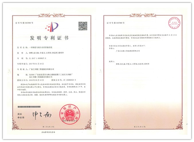 隨著科技進(jìn)步與技術(shù)創(chuàng)新不斷發(fā)展,自主知識產(chǎn)權(quán)儲備,尤其是創(chuàng)造性較高的發(fā)明專利已成為企業(yè)發(fā)展的核心競爭力。近日,廣東匯興精工智造股份有限公司(股票代碼:839258)又新增一項(xiàng)發(fā)明專利——《一種陶瓷馬桶自動存胚輸送線》。