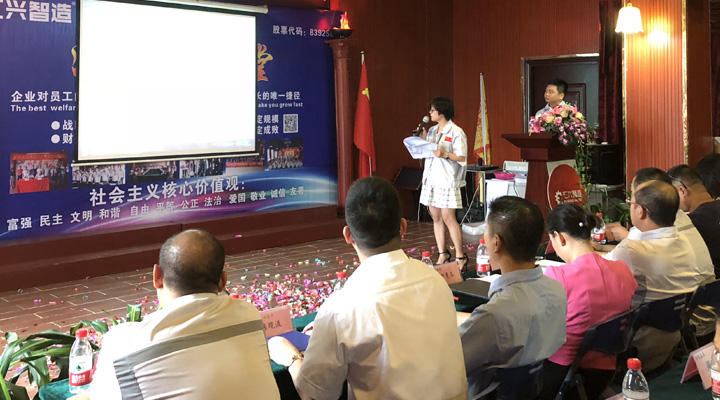 2017年9月28日,廣東匯興精工智造股份有限公司(股票代碼:839258)在匯興學校召開9月份月度大會及重要簽約儀式。董事長鐘輝,辛主任,東莞證券郭副總裁一行,大信會計事務所肖所長一行,華商律師所姜先生一行,中國銀行大嶺山支行葉行長,建設銀行大嶺山支行陳行長,東實集團潘經理等一系列特別嘉賓及匯興智造各分子公司代表參加此次大會。人資行政部經理袁侃主持本次會議。