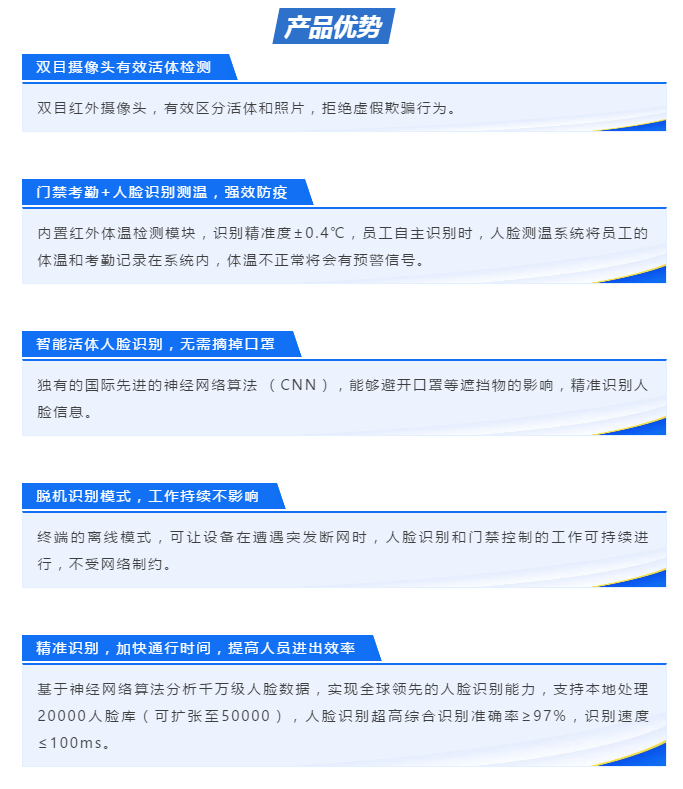 用國(guó)際先進(jìn)的神經(jīng)網(wǎng)絡(luò)算法 (CNN), 是經(jīng)數(shù)千萬次的算法訓(xùn)練后形成的產(chǎn)品,其集圖像采集、人臉檢測(cè)、人臉跟蹤和人臉比對(duì)等功能,不僅識(shí)別率高,同時(shí)識(shí)別速度快。值得一提的是,這款設(shè)備可以輕松識(shí)別出戴口罩的人臉信息,非常適合作為此次疫情防控的有力工具。