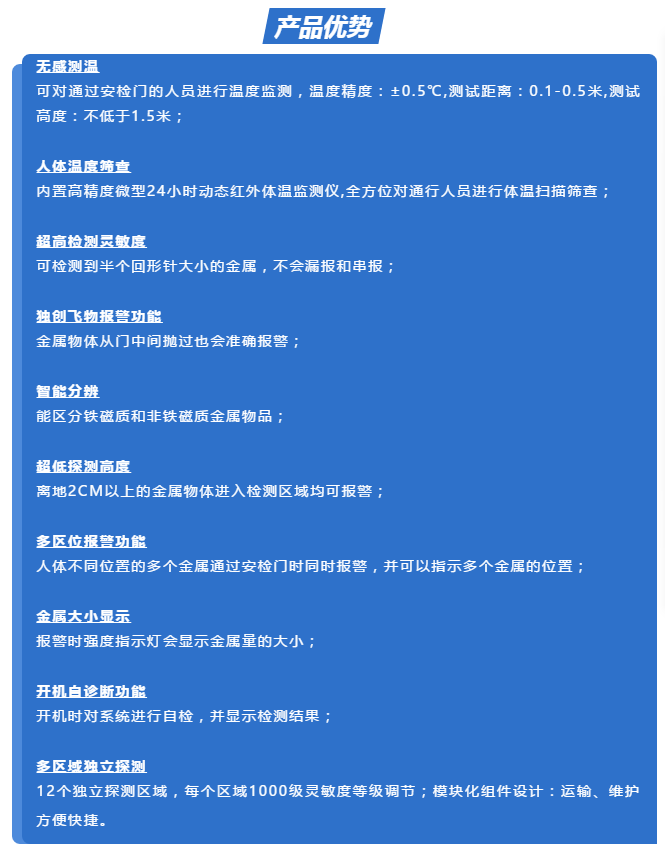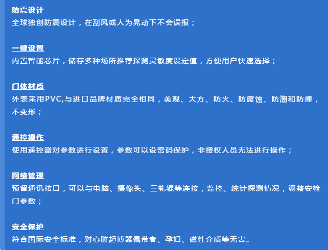 該設(shè)備采用世界先進(jìn)的電磁兼容設(shè)計(jì)和抗震動(dòng)設(shè)計(jì),具有超高靈敏度、極強(qiáng)的抗干擾能力和抗震能力,適用于管制刀具和槍支等危險(xiǎn)物品的安全檢查,廣泛應(yīng)用于監(jiān)獄、法院、學(xué)校、醫(yī)院、電子企業(yè)、港口、客運(yùn)站、展覽會(huì)館、會(huì)議中心、重大慶典、演唱會(huì)等重要場(chǎng)所。
